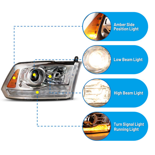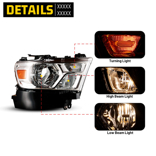 Head Lights for 2019-2024 RAM 1500 Halogen Model Headlights Assembly with Halogen Bulbs Chrome/ Clear