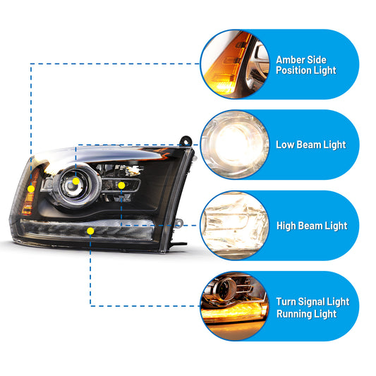 Head Lights for 2013-2018 Dodge Ram 1500 2500 3500/2019-2024 Dodge Ram 1500 Classic with Factory LED Position - Glossy Black/Clear