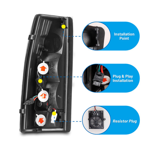 For Chevrolet 88-99 CK/92-99 Suburban/92-94 Blazer/95-00 Tahoe; GMC 88-99 CK/92-99 Suburban/92-99 Yukon; Cadillac 99-00 Escalade LED Taillight - Glossy Black/ Clear