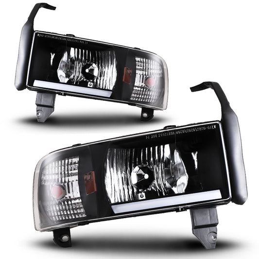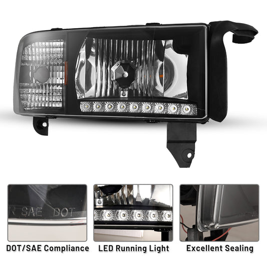 For 1994-2002 Dodge Ram 1500 2500 3500 LED DRL Head Lights - Black/Clear