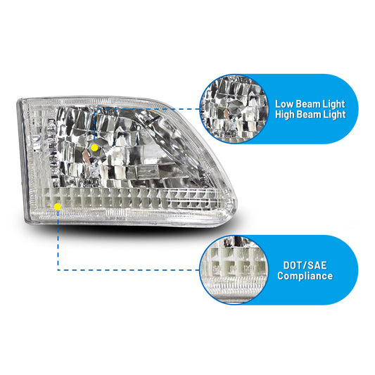 For 1997-2003 Ford F-150/2004 Ford F-150 Heritage/1997-1999 Ford F-250 LightDuty/1997-2002 Expedition Head Light - Chrome/Clear