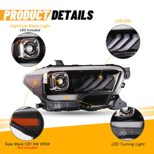 Luces delanteras Toyota Tacoma 2016-2019/Tacoma SR SR5 TRD Sport DRL 2020-2023, negro brillante/transparente