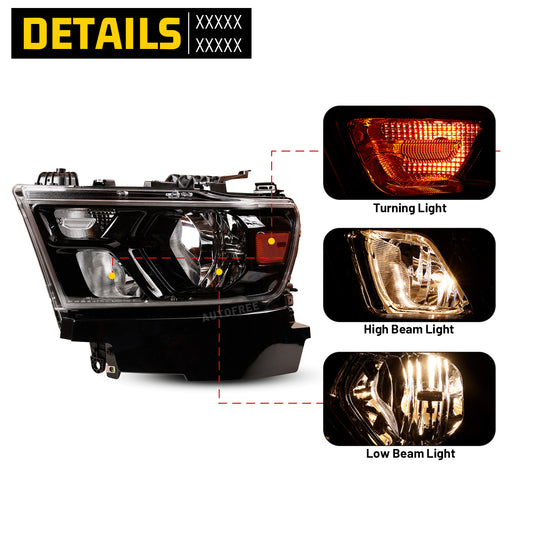 Faros delanteros para modelo halógeno RAM 1500 2019-2023, solo lado derecho, negro/transparente